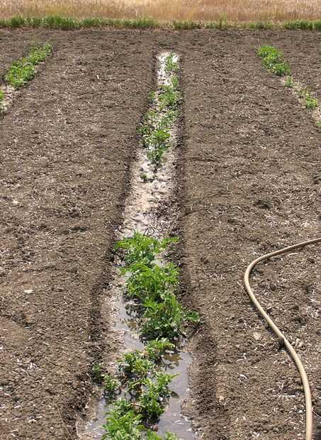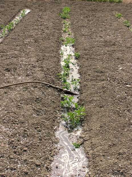 Un problema con el riego de inundación es que la alta presión de agua realmente puede desenterrar las plantas. Sin embargo otro pedazo de basura vino al rescate. Tomé un viejo filtro de arena de un pozo que estaba chutando alrededor y diversos accesorios de tubería y adaptados para encajar el extremo de una manguera. El filtro de arena de latón fue diseñado originalmente para evitar que la suciedad que aspirado por la bomba de pozos. Tiene un montón de pequeñas aberturas. Resulta también funciona perfecto para reducir la presión del agua por lo que sólo las burbujas hacia fuera y fluye con calma abajo de la zanja. También es bastante grande que es difícil de perder o atropellar con el cortacésped. Importante si tienes niños ayudando en el jardín puesto que ese tipo de cosas parece suceder mucho.