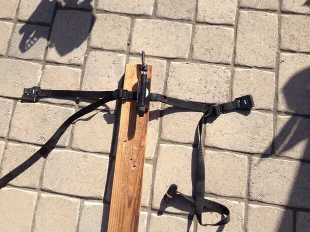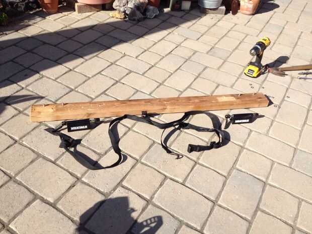 Para construir este estante de bilis necesita un 2 x 4 que caben fácilmente en la parte inferior de la caja de herramientas. Usé uno que era de unos cuatro pies de largo. Necesita soportes de horquilla perno-en bicicleta con pernos, tuercas y arandelas que son lo suficientemente largos para atornillar las monturas de horquilla en 2 x 4. Usted también necesitará dos cintas con ganchos de metal plano cuatro y cuatro tensores de la correa. Si no tienes una vieja bicicleta rack poner alrededor, podrían ser capaces de encontrar uno en una tienda de segunda mano, una venta de garaje o en Craigslist. Piezas de automóvil, hardware o tiendas de artículos deportivos pueden tener sólo las correas y ganchos.