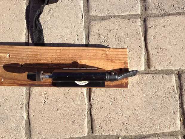 Las monturas de horquilla deben colocarse en el borde de la 2 x 4 para la separación del freno de disco como se muestra en la segunda foto. La distancia entre soportes de la horquilla debe ser el ancho del manillar de una bicicleta que se unirá a la parrilla, además de un par de pulgadas más amplio. Marque y perfore agujeros para los tornillos de las monturas de horquilla. Posición del centro de una de las correas entre los tornillos de las monturas. Perno del monte abajo, apriete la correa debajo de él. Repita con el otro Monte la correa y el tenedor.