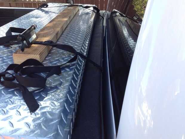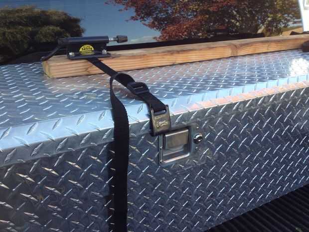 Las correas de espalda Coloque al labio posterior de la caja de herramientas. Centro de la 2 x 4 a un lado y al frente de la tapa de la caja de herramientas. Apriete las correas.