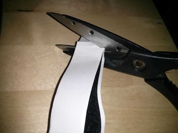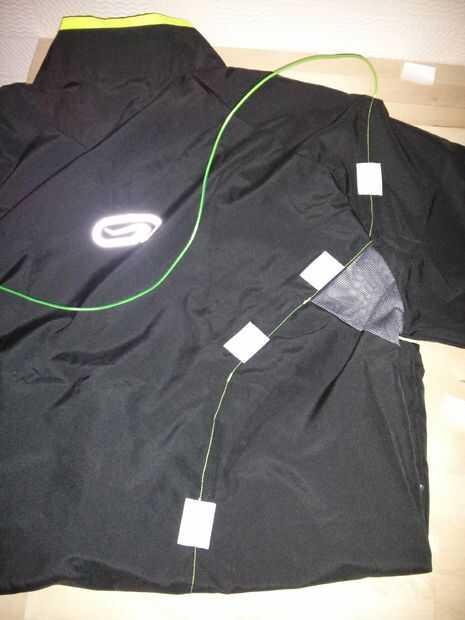 Reducir el número de piezas de Velcro en pares (gancho y lazo pegadas) cada par debe ser alrededor de 30mm de largo. Retire el protector del adhesivo y pegar el Velcro en la chaqueta. De mi lado de bucle de Velcro había pegado abajo, esto es para que si uso la camisa sin EL cable no tengo mucha picazón trozos de Velcro que me molestan.