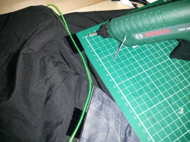 Una vez que han pegado el cable hasta los puntos de sujeción utilice el arma de pegamento para cubrir EL alambre y hacer un sólido común entre el cable el el lado del gancho del Velcro.