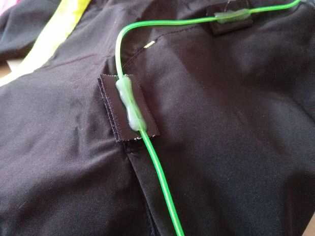 Una vez que tenga pegamento EL alambre para su chaqueta de todo puede que tengas algún cable sobrante (no era el caso para mí) simplemente puede cortar EL alambre a la longitud que desee, sin necesidad de ninguna conexión adicional.