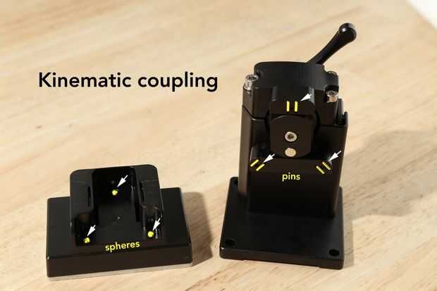 En la parte superior la construcción principal hay tres esferas que sobresalen de la superficie. Interfaz de estos tres sistemas de pernos de metal incrustados en el brazo de la construcción. Juntos forman un acoplamiento cinemático. Este acoplamiento se asegura de que los asientos cabeza de construcción en la construcción del brazo con poco meneo, es útil para la colocación exacta y repetible de impresiones.