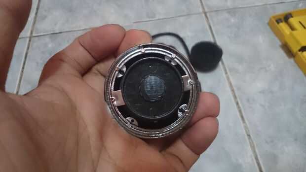 El anillo plateado de plástico tiene dos tornillos y dos agujeros adicionales para la alineación de su cuerpo. Sostiene las vísceras del micrófono.