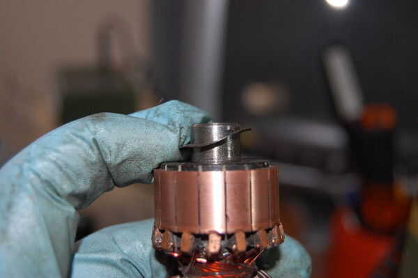 Inserte el eje de impulsión del motor, teniendo cuidado de no perder la arandela ni aplastar las escobillas motor envuelto en cinta.