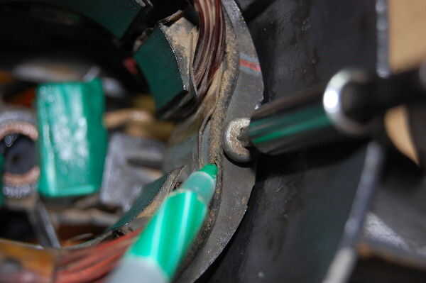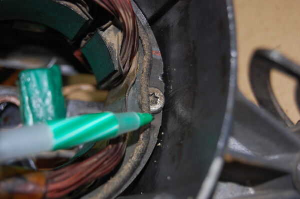 Utilizando los dos tornillos, perno en las bobinas del motor. Tenga cuidado de no aplastar (1) las escobillas del motor en la parte posterior del motor y (2) los cables que están muy cerca de los pernos de retención.