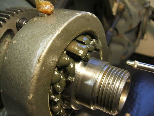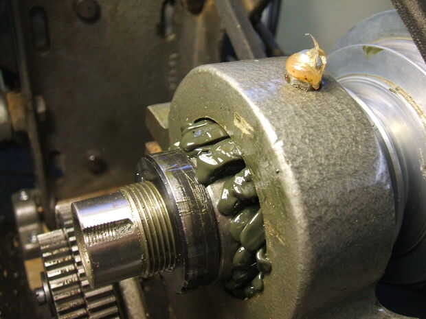 Antes de ejecutar la máquina, tuve que rellenar los rodamientos con grasa. Esto lleva a un buen número de bombas con la pistola de grasa. Sabía cuándo parar porque la grasa comienza a salir el cojinete.