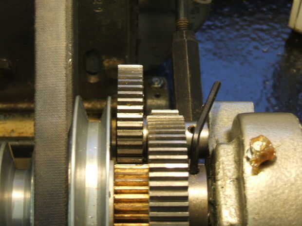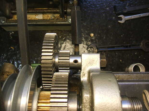 No creo que fui capaz de alinear la backgear de la manera mencionada en el manual (ver paso intro). Si hacía el lado izquierdo de la backgear al ras con el lado izquierdo de la parte del 21 diente del cluster backgear, entonces el 56 diente parte del cluster no era cerca del centro del engranaje de bronce de 30 dientes. Solo fui por un compromiso, con holguras razonables en ambos lados del cluster. Reforzado el prisionero de backgear cuando era feliz.