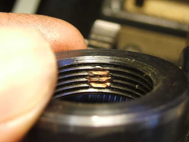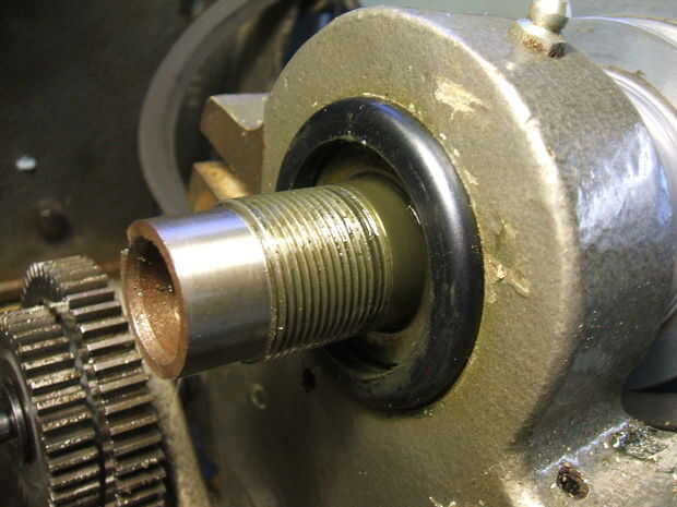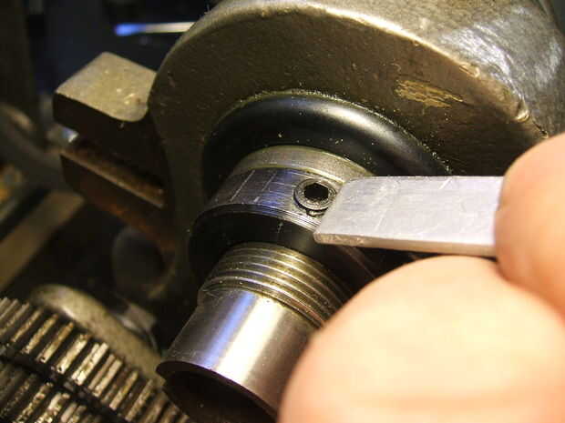 Aflojar el tornillo prisionero en el collar de bloqueo. Se puede ver en las fotografías donde alguien ha utilizado una llave para apretar el anillo de cierre; No apetece para deshacer, así que un hilo del prisionero que muestra sobre el anillo a la izquierda y utiliza un aluminio 'drift' aprovechar el anillo gratis. No toma mucho esfuerzo.
