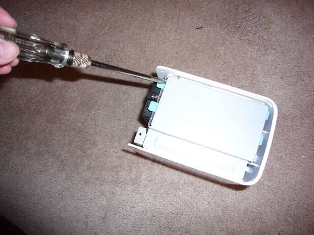 Coloque la cabeza de su destornillador sobre una de las piezas de plástico azul y damos un empujoncito. La cubierta debe deslizarse y debe haber un espacio donde el tornillo sostiene la cubierta de metal antes.