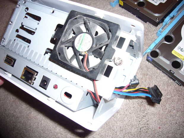 Seguir los cables rojo y negro del ventilador en la caja. Nunca molestó con tratar de abrir el resto. Gire el caso y tratar de buscar en donde se colocaron los discos duros. Debería ver un conector blanco de tres pines. Simplemente desconectar y que debe desconectar el ventilador.