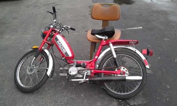 Hay unos motores Sachs diferentes por ahí, creo que estamos trabajando con el modelo 504, aunque puedo equivocarme. No importa tanto, son todos bastante similares. En lugar de drenar el aceite del motor, vamos a inclinarse sólo el ciclomotor a su lado. Colocar un trozo de cartón o un trapo, en caso de cualquier derrame. Apoyarse en un cajón de leche o silla o el tocón de árbol o algo.