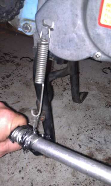 Después de eso, quite el resorte centerstand. Poner en las gafas de seguridad protectoras, o podrias poner hacia fuera un globo ocular. En serio. Usé una herramienta de eliminación de primavera que hice de una barra de aluminio y cable de freno.