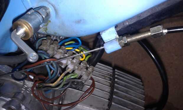 Después se escurre el aceite, vamos a aflojar el cable del embrague. Típicamente hay un Ajustador que puede ser aflojado. Debe ser una tuerca de 10mm que se puede desenroscar para hacerlo.