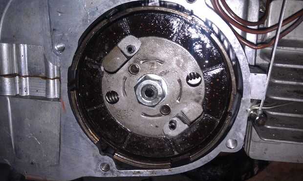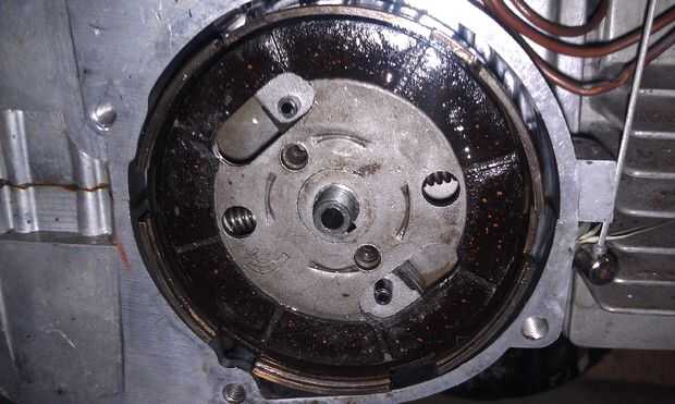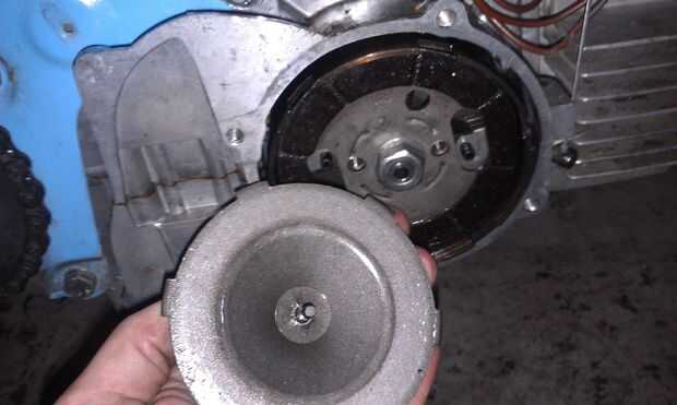 En el centro del embrague (montado en el cigüeñal) es una tuerca. Mina era una tuerca de 17mm, pero también he visto nueces 15mm y 14mm. Elimínela. Utiliza un controlador de impacto eléctrico, pero también funciona un combo de comando llave impacto neumática driver o pistón parada/socket...