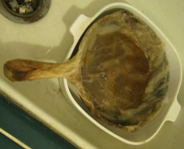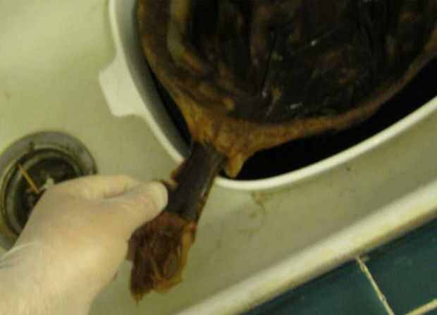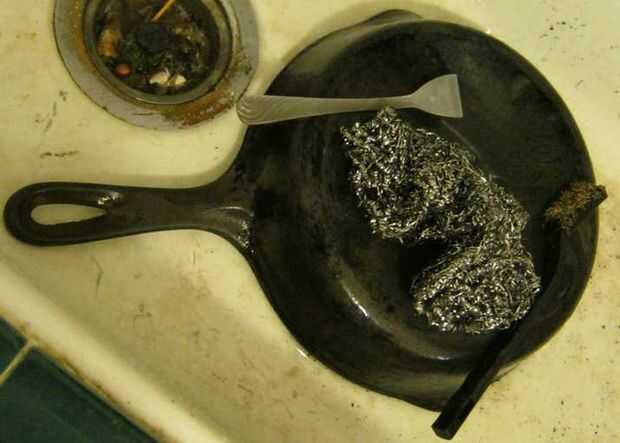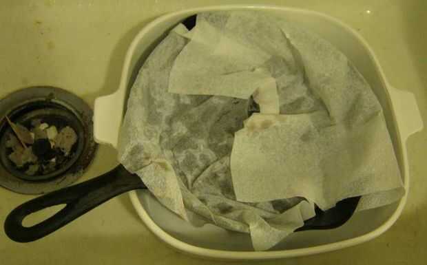 La servilleta debe girar marrón oscuro, que es el curado viejo. Después de un día, deben ser retiradas las servilletas y el hierro fundido debe ser fregado por cualquier medio necesario. Si todavía hay parches de sazón, debe repetirse el proceso. Puede tomar hasta 3 + repeticiones tira de condimento realmente grueso, pero es todavía más fácil que fregar apagado.