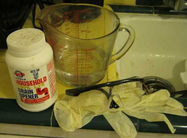 - Agregar 1-2 cucharadita de lejía al 1/4 a 1/2 taza de agua, hacerlo lentamente, revuelva con frecuencia y use guantes y gafas de seguridad.
