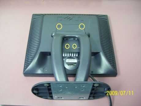 La primera cosa a hacer es quitar los cables de alimentación y señal. Retire el soporte de monitor desenroscando los cuatro tornillos Phillips se muestra dentro de un círculo amarillo. Cuando el soporte está apagado, puede retirar la carcasa trasera introduciendo un destornillador plano en la ranura en la parte inferior. La caja tiene unos Cierres sintéticos que deben ser liberados. Levante suavemente las dos mitades separadas y solo trabaja su manera alrededor de la caja que separa las 2 piezas. Después de que el caso está separado retire al monitor y ajuste las mitades al lado para más tarde volver a armar