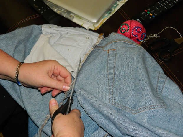 Como cortar la costura interior, será divertido en el bolsillo como se incorpora a la costura. ¿Traducción? Muchas capas de tela! Así que al llegar a este punto, abre a la tela y corte con capas como pocos como sea posible. También puede tener que lidiar con remaches en el sitio de bolsillo. Estos pueden ser diablos en tijeras, así que ten cuidado!