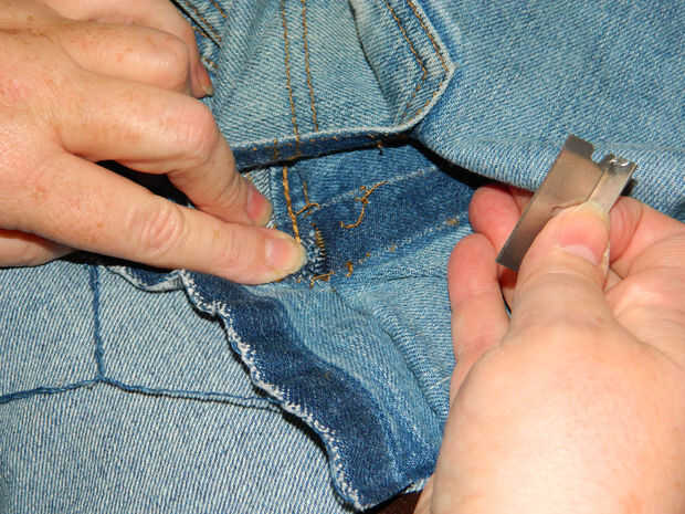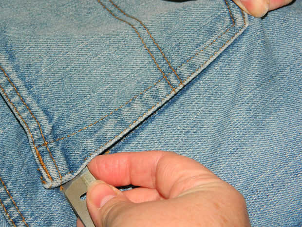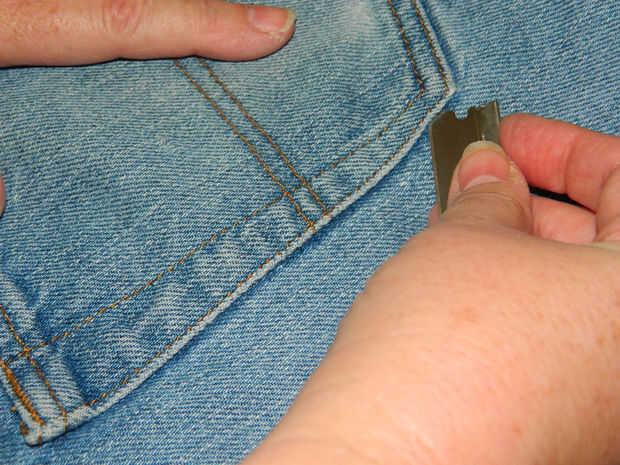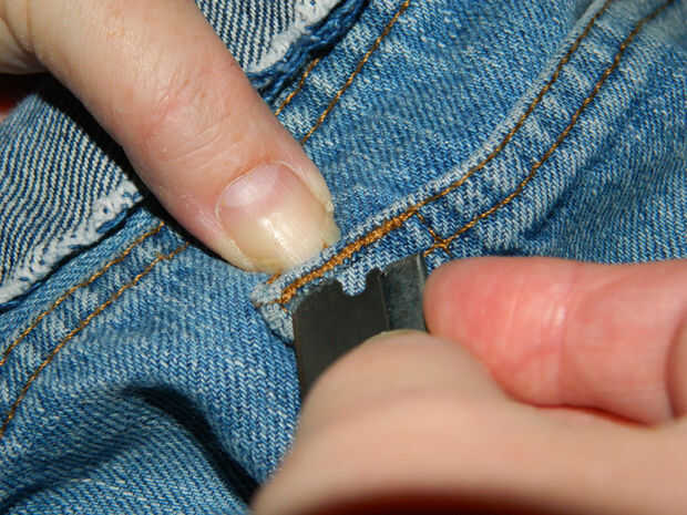 Una vez más, tire el borde afilado de la hoja de afeitar a través del refuerzo en las dos esquinas, una o dos veces. Una vez que has conseguido pasar la costura de refuerzo, el resto de la cavidad es bastante fácil.