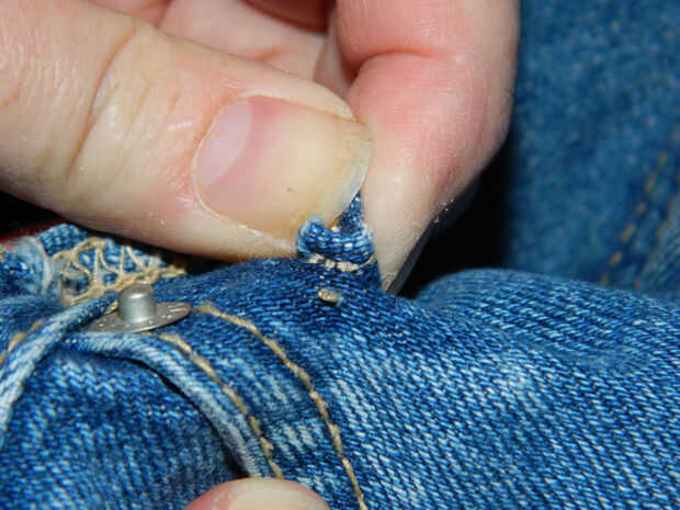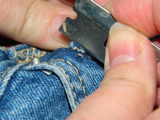 Los pantalones vaqueros son difíciles. Y una de las cosas que hacen los pantalones vaqueros tanto tiempo dura el refuerzo en puntos de tensión. Como los bolsillos traseros y lazos de la correa y parte inferior de la cremallera. La clave para lo que es más fácil deconstruir un par de jeans es en la lucha contra a estos refuerzos. Corte a través de la costura reforzada es la manera más fácil y sencilla para aflojar el resto de la costura.