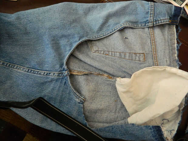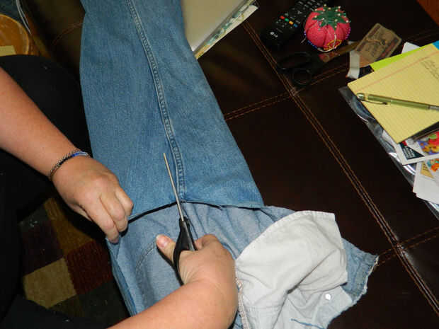Ahora usted tiene esencialmente dos piernas separadas. Ahora quieren dividir las costuras para capturar tanto del tejido como sea posible. Comience por cortar a lo largo de la costura externa hasta el dobladillo. Cortar el dobladillo inferior.