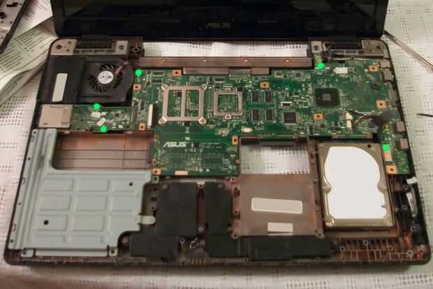 Si desea cambiar la pasta térmicamente conductiva en GPU o CPU, tienes que quitar los tornillos con el símbolo de triángulo (en la imagen color verde) y levante suavemente la placa base (comenzando por el lado izquierdo) enchufe de salida LCD y conexión Wi-Fi cintas. Usted está listo para quitar la placa de la carcasa.