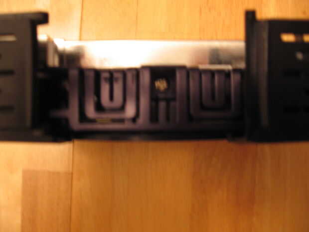 Ahora, echemos un vistazo a los lados. Hay tres tornillos total, aunque cuatro agujeros, así que el modelo puede ser diferente. Usted puede sacar estos tornillos ahora si quieres (son tornillos normales), pero no trate de remover estas vías plástico todavía.