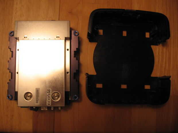 Ahora lo que tienes que hacer es tirar de la parte posterior de la caja un poco y jale hacia arriba la parte posterior de la unidad principal. Los puertos de switch, USB y firewire de poder sólo deben borrar el espacio. Al hacer esto, ser conscientes de las patas de plástico que suben a través de los paneles laterales de plástico. A continuación, desea lenta y cuidadosamente mueva la parte delantera de la unidad hacia fuera. Una vez que la unidad está libre de la otra mitad de la carcasa exterior, a ver por qué usted no sacar los paneles laterales de plástico todavía. Usted ahora tendrá acceso a los tornillos ocultos que no pudo llegar antes. Adelante y sacar todos los tornillos y retire los paneles laterales de plástico. Son adhesivas, pero no tanto que cualquier fuerza será necesario.