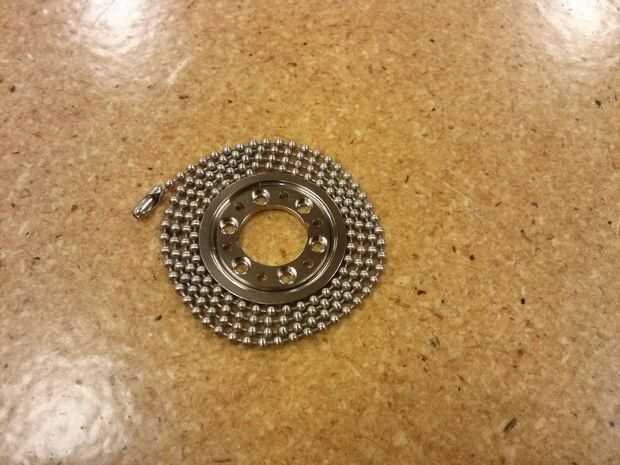 2 - una longitud de cadena. (Yo tengo la mía de Ace Hardware. Su es casi de 2' de largo y es de acero inoxidable. Es tamaño #13).