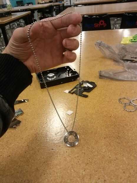 Retire todos los tornillos en el exterior de la unidad de disco duro. Asegúrese de comprobar en las etiquetas y pegatinas. Conocerá con algo parecido a la foto 2. En la parte superior izquierda de la esquina, de mi disco duro (puede ser tuyo en una esquina diferente), es un imán. Utilizar el destornillador plano por debajo de este y después hacia fuera. Esto atraerá el imán de la cáscara. Es potente, así que levante duro! Más todo será complemento o pulsar, para que en su mayor parte podrás quitar todo fácilmente. Los discos brillantes son lo que almacena en su memoria. Se atornillarán sobre ese pequeño disco de aluminio en el centro. Una vez que quitas los tornillos, los discos podrán ser levantadas fácilmente. Cada disco se separarán por una rueda, pero no te preocupes, se levanta así. Una vez que tengas todas las piezas desmontadas todas ahí queda que hacer es tomar el disco superior hacia abajo de los discos de memoria que la Honda de la cadena a través de él y ponerlo alrededor de su cuello! Y listo! Ahora tienes un, poco, uno de un collar bueno que parece un pedazo de una tecnología futurista!