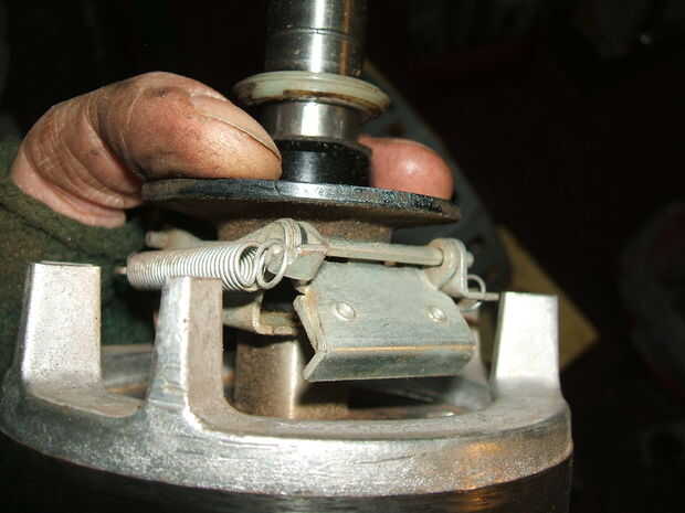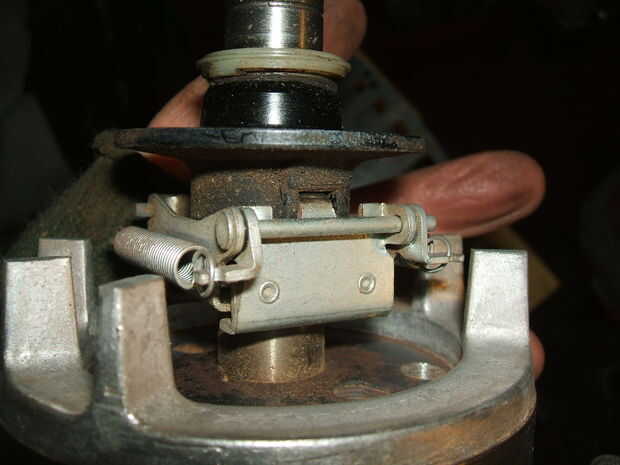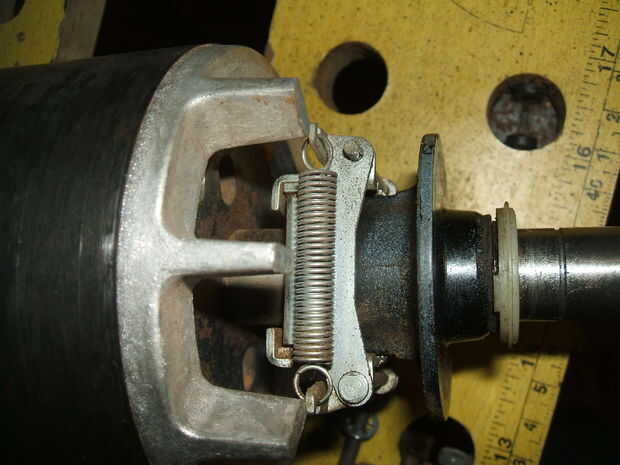 Cuando el rotor no está moviendo (o lentamente) el contacto se empuja cerrado por el anillo de plástico negro que se puede ver en estas fotos. Como el motor gira más rápido, el collar es tirado lejos de la Junta de contacto por dos pesos que swing hacia fuera - el contacto es entonces roto y la bobina se desconecta, dejando el motor en marcha en su bobina de corriente.