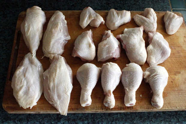 Ahora se limpia la carne de los huesos, también tienen un caparazón de pollo sobrante.