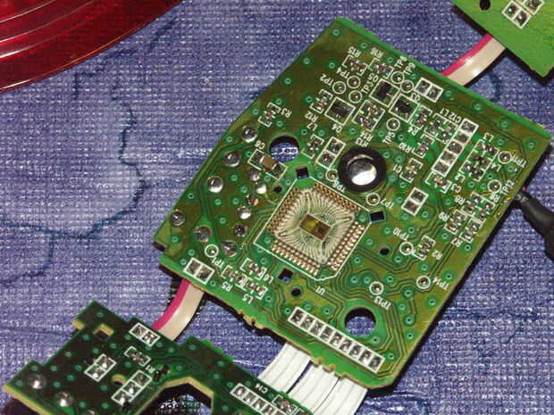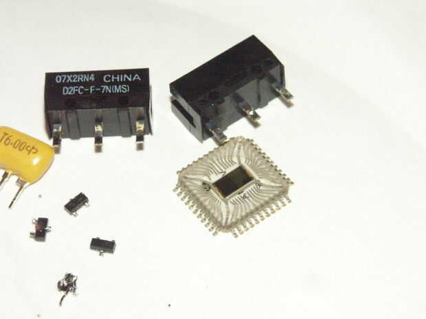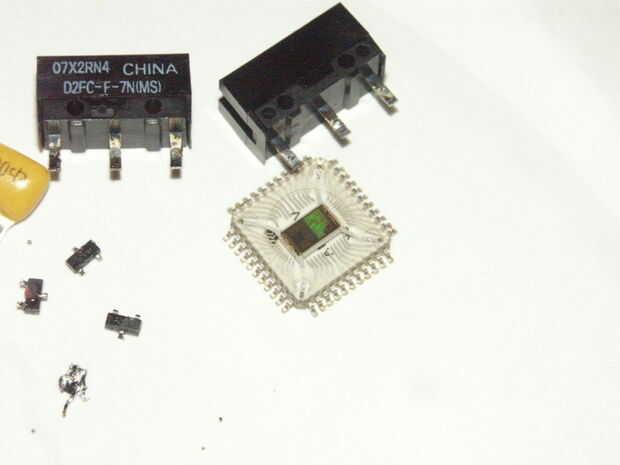 Hay algunos chips interesantes, pero probablemente no son útiles como fichas para el aficionado. El sensor óptico se rumorea que es utilizable como una cámara de baja resolución (32 x 32 píxeles?), pero en la versión más reciente del ratón, la cámara y el microprocesador se ponen juntos en el mismo "ratón en un chip", quizás que la cámara ya no es accesible. El microcontrolador USB en el ratón más viejo parece para ser una estándar algo parte de Cypress, pero probablemente no es reprogramable.