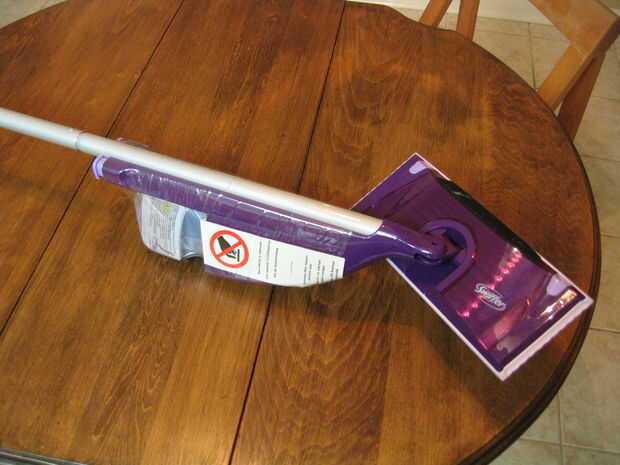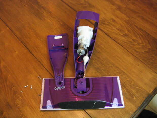 el Swiffer WetJet es una barato fregona desechables ($20-$25) fabricada por Procter & Gamble. Tiene un receptáculo en la parte posterior para un tanque de limpieza líquido y una bomba con pilas (accionado por un interruptor en el mango) que lanza líquido de dos boquillas en la parte delantera de la almohadilla de trapeador. Toda la unidad se puede desmontar fácilmente, y puede recuperar el conjunto de la bomba todo a usar tu propio homebrew robótica micropipeta, sintetizador de ADN o bar-bot.