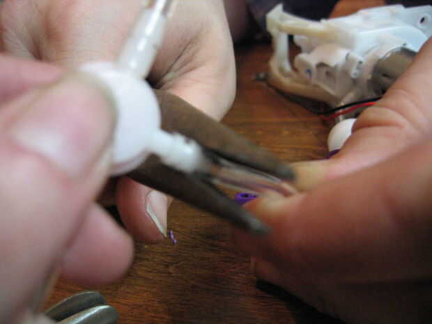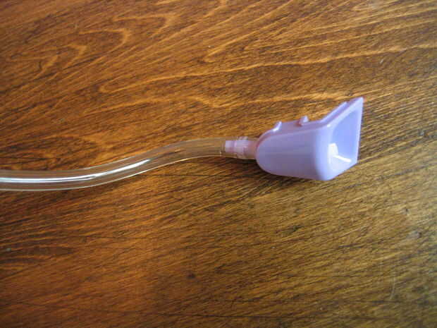 La Unión en T de Levante y sostenga firmemente entre el dedo y el pulgar. Sujete firmemente la manguera y accesorio que se coloque la Unión en T a la salida de la bomba (pero no demasiado firmemente, no machacar la guarnición plástica o romper la manguera) con los alicates de punta delgada y giro hacia adelante y hacia atrás para aflojar. Entonces puede deslizar la manguera hacia fuera a través de la articulación de la cabeza de la fregona.