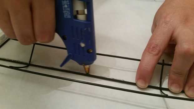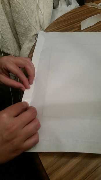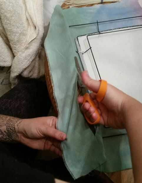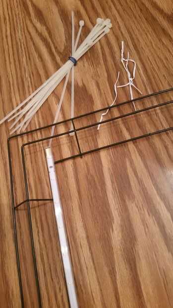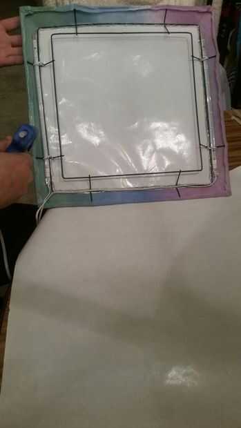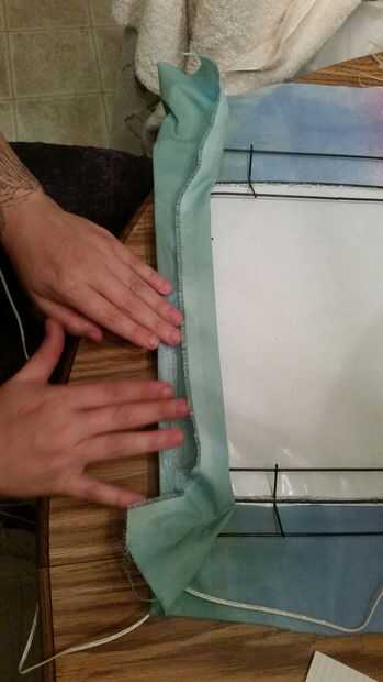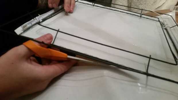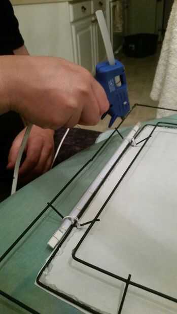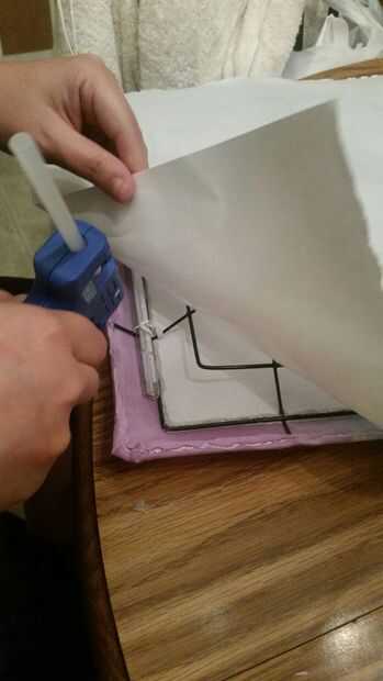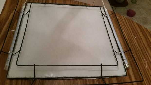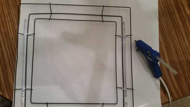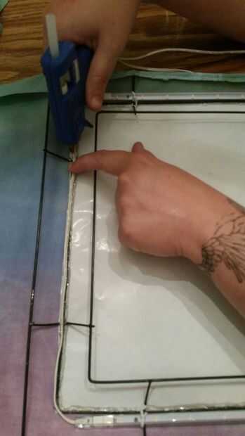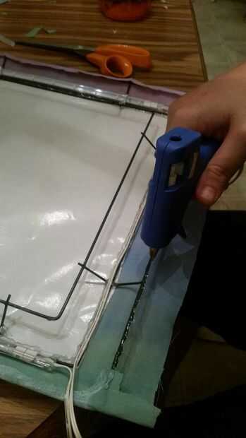 This step should really be called Glue All The Things! Porque después conecta tu LED con ataduras de cremallera o lazos de torcedura, todo lo que haces es pegamento. Utilicé papel de congelador en la parte delantera cuadrada debajo de donde termina mi arte difundir la luz antes de que golpee directamente la tela. Me adherí a la tela directamente en el alambre exterior, tirando de él burla y cortar la tela sobrante. No quería que cualquier sombra extra en mi cuerpo por lo que asegurado mis cuerdas para venir hacia fuera mi parte inferior. Entonces pegué papel de congelador a través de la espalda entera. Cuando até mis LEDs me aseguré que señalaban el tejido por lo que refleja en el papel de congelador blanco y hacia el arte. Esto también ayuda a difundir la luz. Para asegurarse de que tengo una buena ventaja en mi panel de la parte posterior del papel que pegué en una plaza que era ligeramente más grande que necesitaba y optó por doblar mis aletas y adherir plana en lugar de recortar mis bordes.