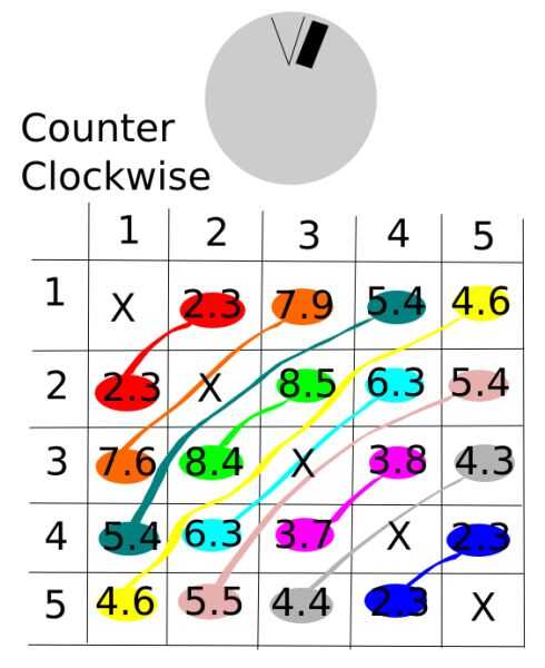 Los gráficos en esta página son reproducciones digitales de las tablas que hice en una hoja de papel mientras estaba en la fase inicial de descubrimiento de mi Variac. Hice dos de estos, porque claro hay un control en un Variac y cambian de estas lecturas como se manipula el control. Los números en las tablas son las lecturas de ohmios grabé medirlas pares de terminales entre sí.