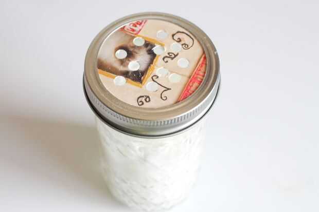 Si usas un tarro de masón como yo, usted necesitará hacer una tapa de la coctelera. Para ello, utilice el sello interno y traza alrededor de él en alguna cartulina. Corte hacia fuera y perforar los agujeros y está bueno para ir!