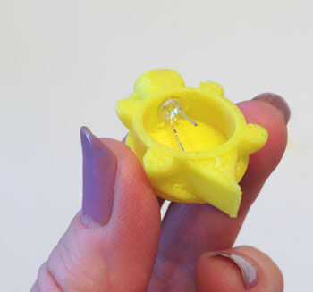 Una vez que la tortuga está limpia, inserte la luz a través del cuello del LED desde el interior. Inserte la batería en la "panza" de la tortuga, asegurándose de que quede entre las dos patas del LED (positivo con positivo).