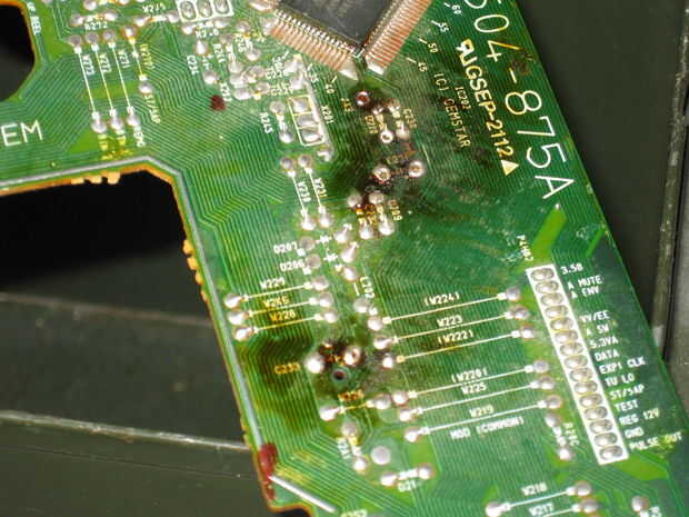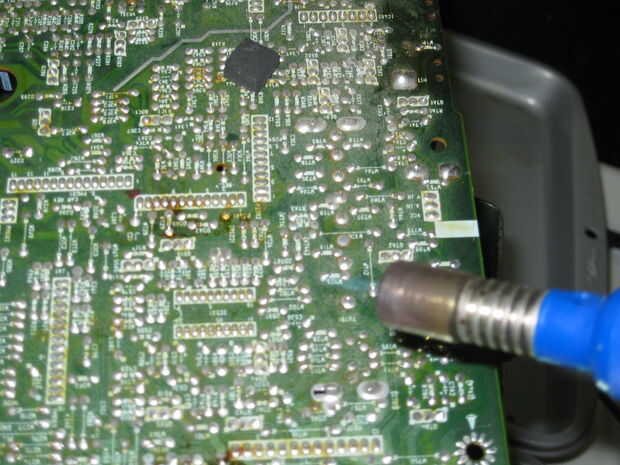 Todo lo que tienes que hacer es ejecutar el toque sobre la parte posterior de la placa. Trabajo en una pequeña zona que va desde un componente a componente. Una vez que vea la vieja soldadura brillante de conseguir eso significa que está en su estado líquido y está listo para retirarse. A menudo los componentes sólo caerá fuera de allí los agujeros. Algunos se cuelgan y necesitan un poco de ayuda. Aprovechando el tablero en el lado de la caja ayudará a algunos de estos componentes atascados hacia fuera. Algunos de los componentes será más difíciles para que se suelte luego otros porque hay cables están doblados sobre. En estos casos tienes 2 opciones disponibles para usted.
