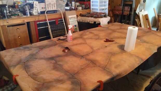 Lo primero que hice fue armar todas mis piezas en el orden que yo quería. Las abrazaderas ven en la imagen eran más presionado los bordes había extendido más allá de la mesa para no evitar chocar contra ellos y golpeando en el suelo... bueno tener pero no es necesario. Ahora que ya tienes lo presentado, tiempo para empezar cosiendo las piezas junto con el hilo grueso de la cera... Utilizar una puntada áspera y descuidada. Esto no es bonito y no es Martha Stewart así que este look como malo (o bueno) como quieras! Coser cada pieza hacia abajo, también desea comenzar el cepillado en la segunda capa de látex.