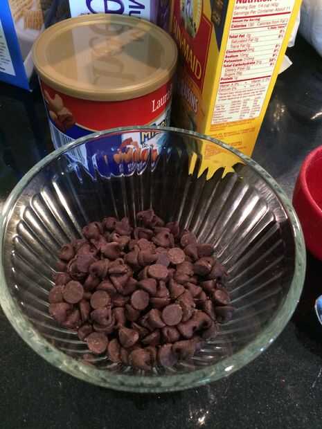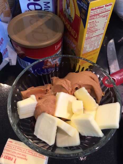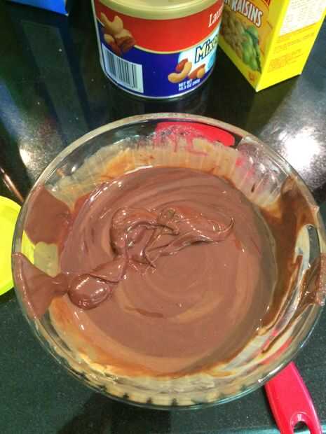 Mezclar los trocitos de chocolate, mantequilla y mantequilla de maní en un recipiente de vidrio. Luego poner en el microondas hasta que el chocolate se derrita y los tres se mezclan bien. Esto debe tomar solamente uno o dos minutos dependiendo de tu microondas.