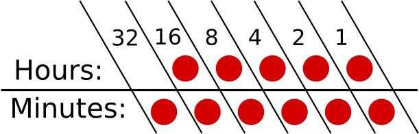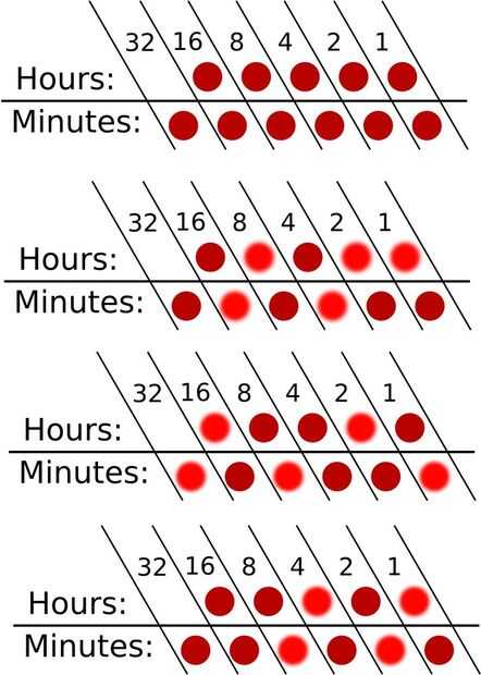 En la siguiente imagen se puede ver cómo la pantalla suele ser leer. Sólo tiene que añadir juntos los valores de los LEDs encendidos para obtener la hora. La segunda foto en este paso tiene algunos ejemplos.