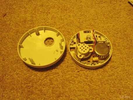 en primer lugar, me torcí la tapa de la parte posterior de mi detector de humo. Hay tres pequeños clips en la parte inferior, por lo que les puedan regresar y quitar la tapa, y consiguió algo que parecía la imagen 2. Esto puede variar con el modelo. Lo que necesitamos es este pequeño artilugio blanco, con lo que parece ser una pieza plana de metal. NO ABRA LA CARCASA DE METAL CON LA ADVERTENCIA DE RADIACIÓN. ¿Contiene americio, que es un elemento radioactivo, y no queremos envenenamiento por radiación,?
