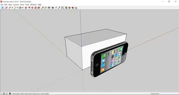 Simplemente comience por dibujar un cubo en las dimensiones que desee su reloj para obtener una indicación. También puede descargar el modelo de su teléfono de la biblioteca de Sketchup. En mi caso he añadido mi iphone 4 a ver si las proporciones donde la derecha (ver figura 1).