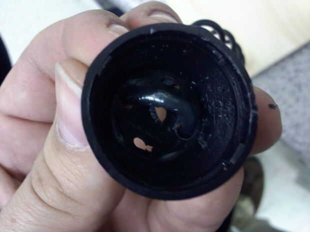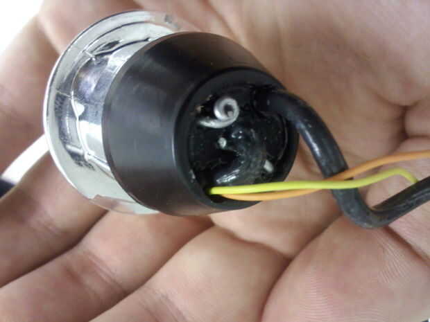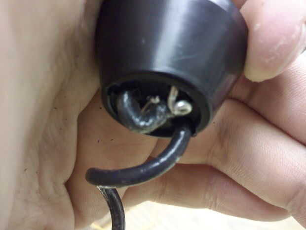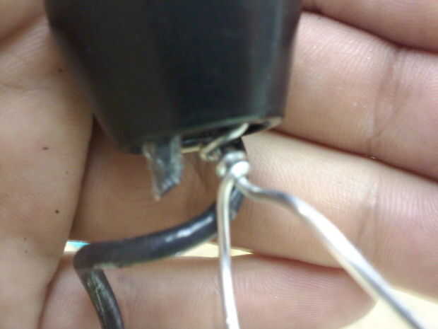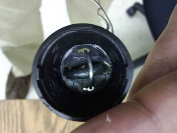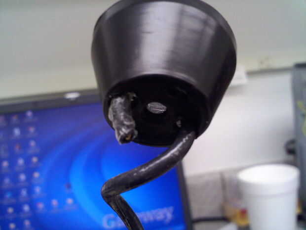 Comencé tomando un cable por el conducto y envolviéndolo alrededor del exterior, creando una bonita espiral. Luego yo a el alambre torcido fuera del conducto. Luego estiró hacia fuera y conectado al cono negro que he mencionado anteriormente. El cono negro viene con algunos circuitos de la linterna que se le atribuye, pero se quita fácilmente. Ahora que tienes solo la pieza cono plástico, hacer dos agujeros en los bordes, cada uno lo suficientemente grandes como para que el alambre que quepa. Alimentó para arriba y luego hacia abajo y hacia el otro lado, que se encrespan debajo. Luego usé el cable delgado y flexible de la tubería portacables para asegurarla más. Los dos cables largos que eran soldados anteriores pueden ser alimentados a través de la parte posterior del cono negro y el bulbo puede ser torcido en su lugar. He añadido un poco de pegamento para mantenerlo Unido.