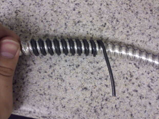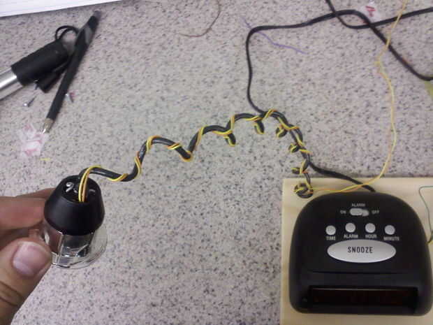 Para dirigir la "luz" que genera el reloj de alarma, decidí añadir un cuello ajustable. Al principio pensé que podía usar conducto del cuello pero desde que he limitado a herramientas y hardware en el colegio, yo no podía fijarlo a la base muy bien. Además, fue bastante duro doblar y no ajusta demasiado bien. Terminé usando sólo uno de los cables dentro del conducto. Resultó bastante bien. Fui capaz de sujetar sin hardware, sólo un agujero en la base.