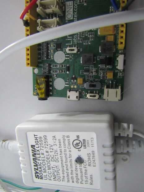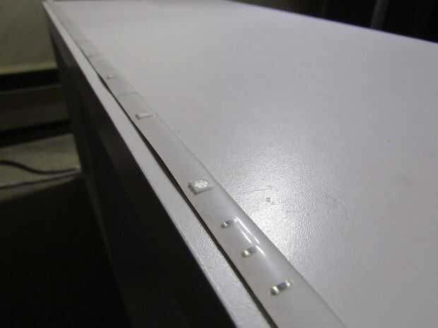 Empezar por retirar la cinta en la parte posterior de la tira de LED, para que el adhesivo es utilizable. Luego, coloque la tira de LED en la parte superior de una mesita de noche. Después de coloca la tira de LED, utilice pegamento caliente para montar el Linkit, fuente de alimentación y el relé al lado de la mesita de noche.